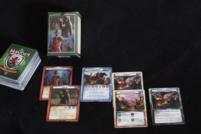 Havoc! Free Havoc! III (Knight) Duel Deck. This provides 108 full-color cards in a tuck box, which are all the cards needed to play a one-on-one fight between a fantasy Knight (Grimm Sibbe) and the Bear or the Hobgoblin Heavy Infantryman.