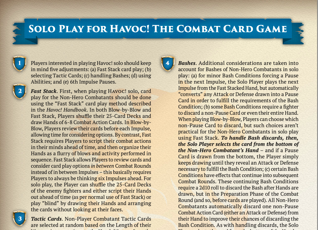 Each campaign features escalating battles and distinctive foes designed to test tactics, luck, and endurance. You can also use the Solo Play Handout as a template for designing your own Havoc! Campaigns.